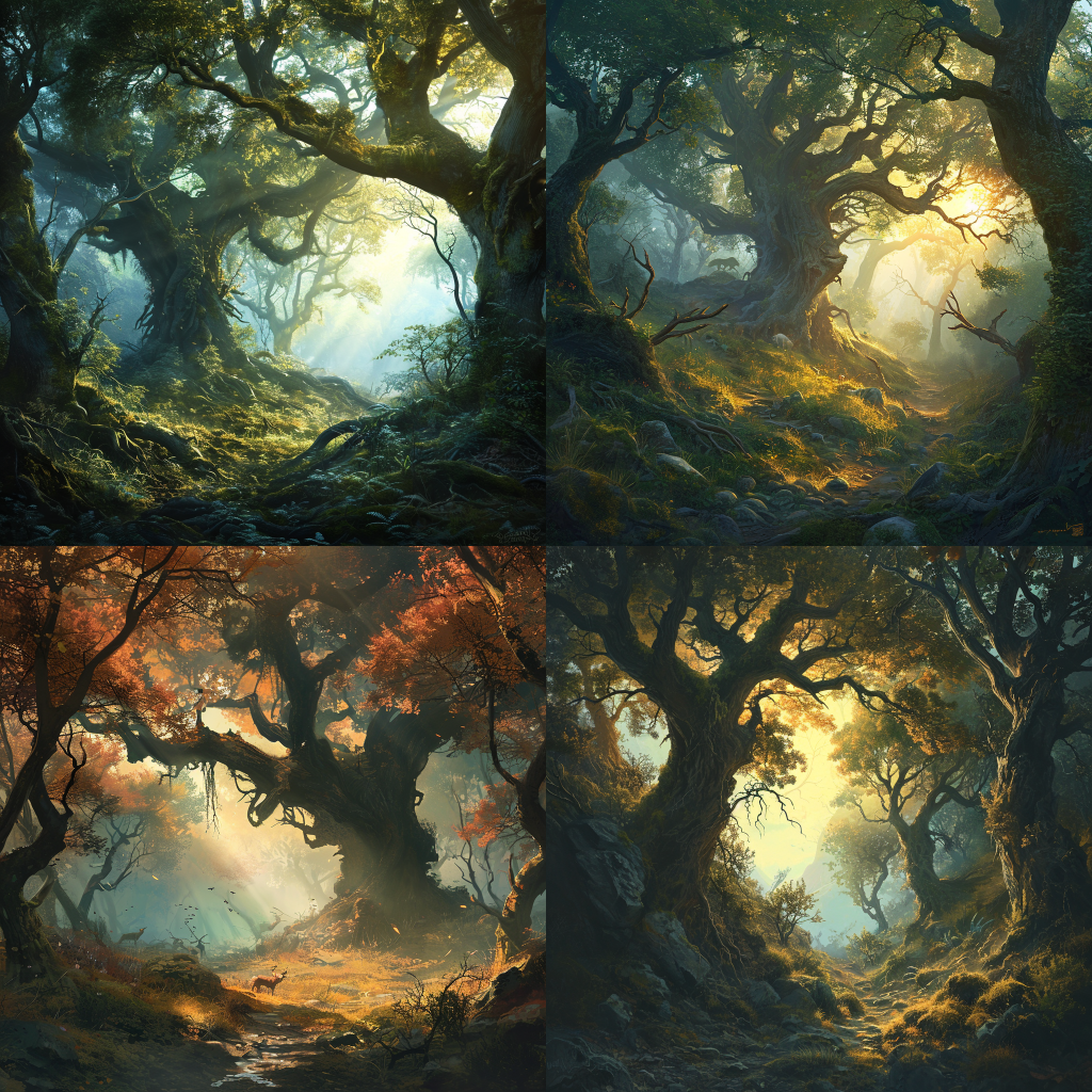 Mythical Forest Scene: A fantasy illustration depicting mystical creatures and ancient trees in a forest, illuminated by morning sunlight.