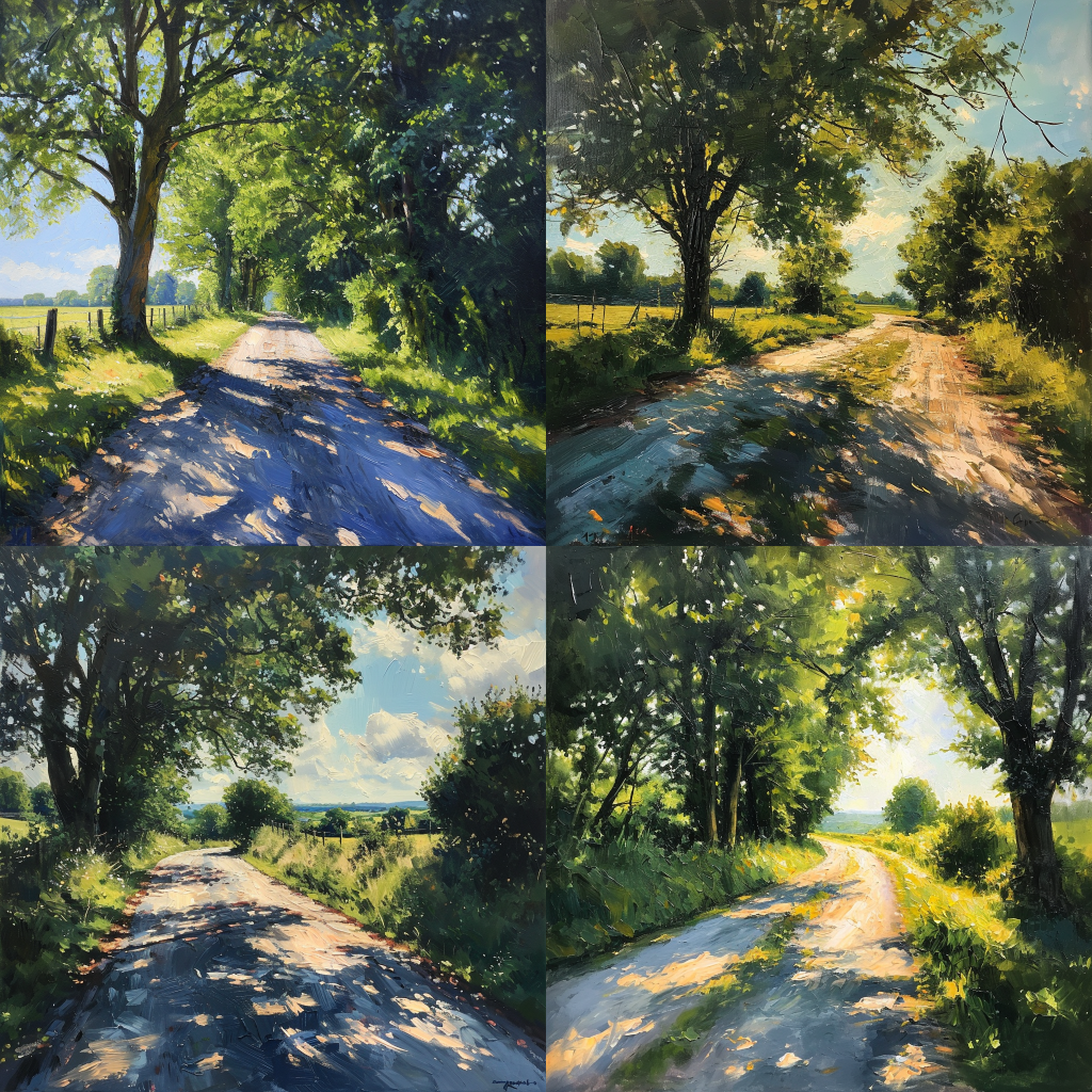 Summer Memories: A landscape painting in the style of a masterpiece, capturing the summer sun and tree shade on a quiet country road in the afternoon.