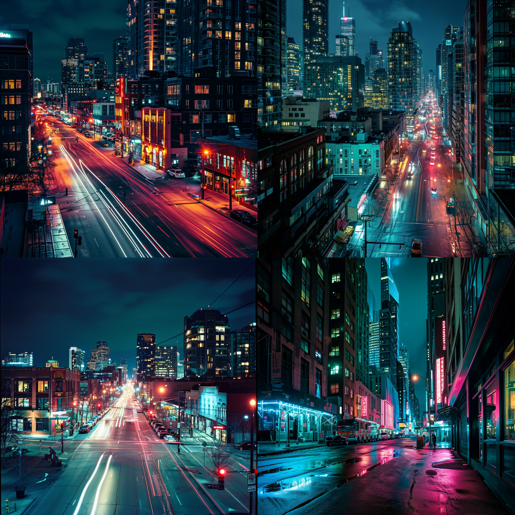 - Who: Bright lights and buildings of a bustling city center (번화가의 불빛과 건물들)