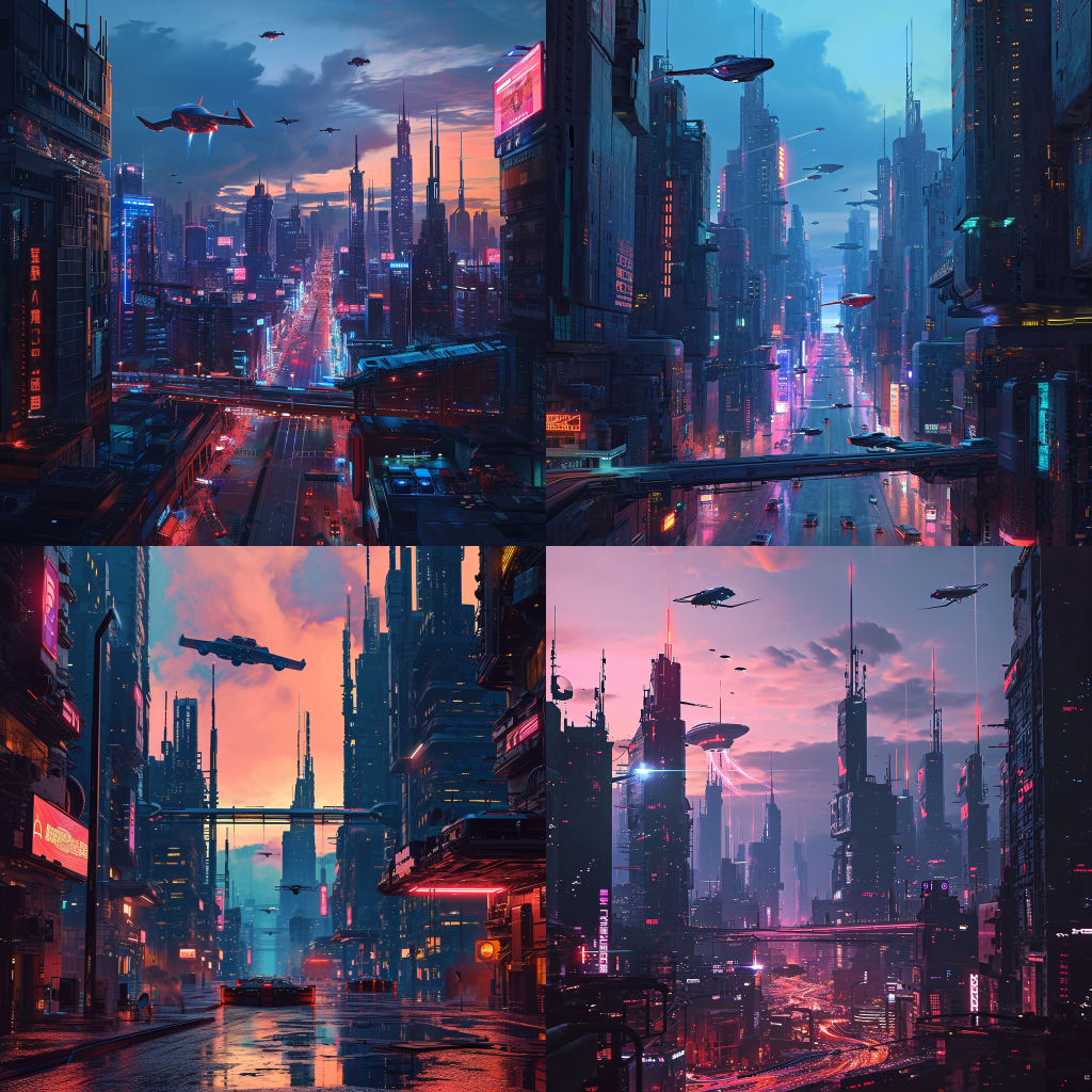 Futuristic City Concept Art: Concept art of a futuristic city with flying vehicles and skyscrapers, set in a cyberpunk style during dusk with neon colors.
