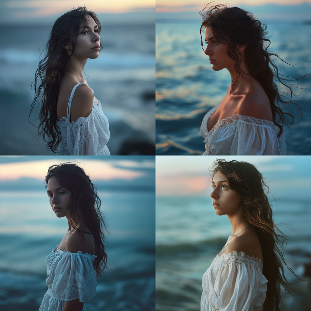Portrait at Seafront: A beautiful woman with long brown hair in a white dress standing by the sea during the blue hour, rendered in soft colors.
